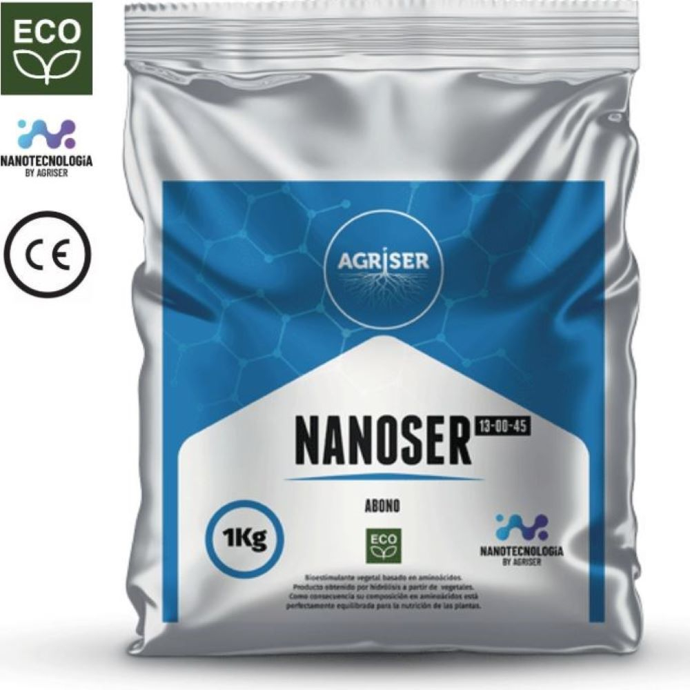 NANOSER 13-00-45 este un îngrășământ NK solubil, destinat utilizării prin fertigare. Produsul conține aditivi care sporesc absorbția, permițând ca doza de aplicare să fie de 10 până la 20 de ori mai mică decât a NPK-urilor solubile în apă convenționale pe bază de produse minerale. În compoziția sa, conține elemente care exercită un puternic efect biostimulant, observându-se asupra plantelor efecte chiar mai bune decât în cazul NPK-urilor convenționale. Utilizarea continuă a îngrășămintelor minerale în doze mari a condus la un nivel de salinizare a solurilor care, în unele cazuri, compromite viața plantelor și trebuie corectat pentru a avea un sol durabil. Doza redusă a acestui produs contribuie, în acest sens, la menținerea unui sol cu salinitate scăzută și la o sustenabilitate mult mai mare a culturii. PROPRIETĂȚI FIZICE Aspect: Pulbere solubilă COMPOZIȚIE (greutate/greutate) Azot total (N): 13,00%